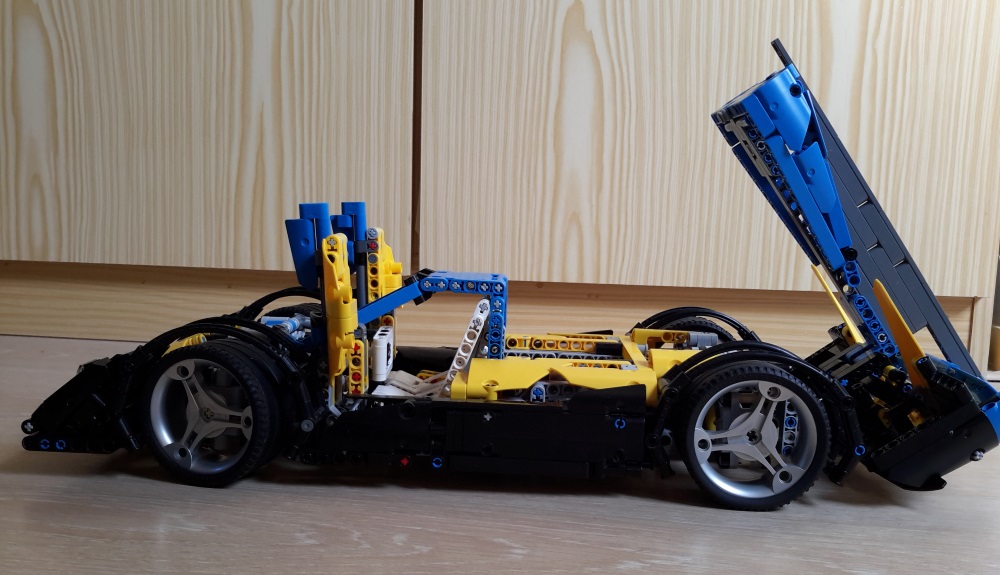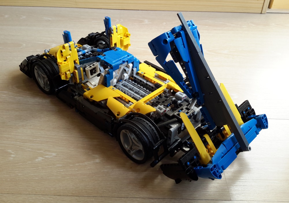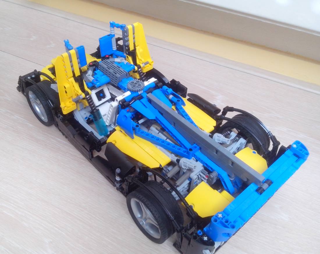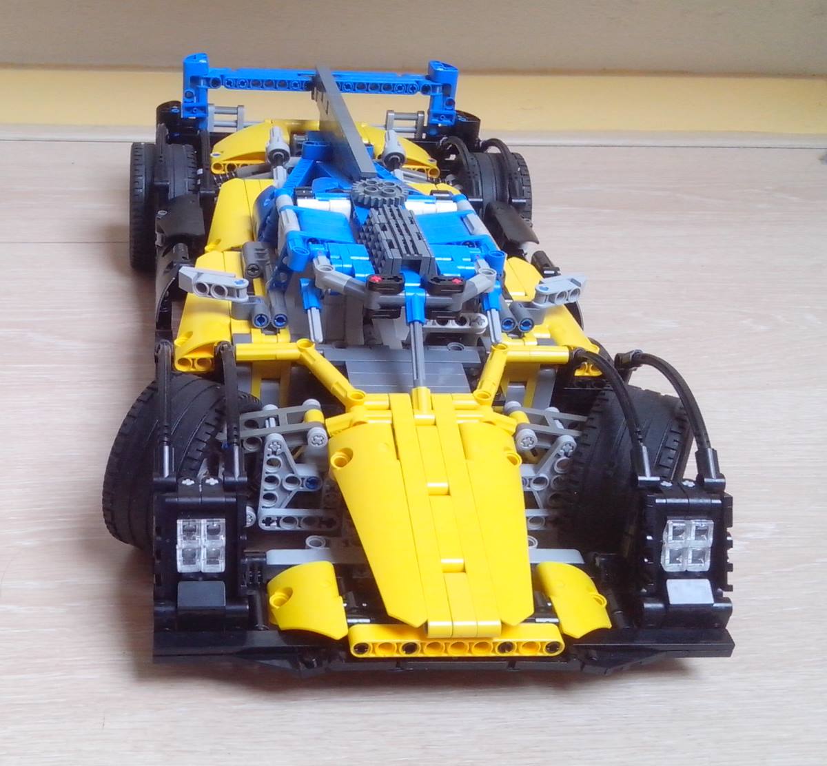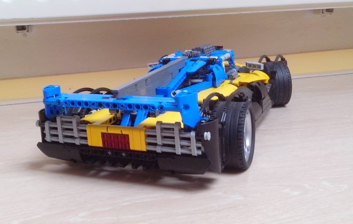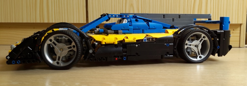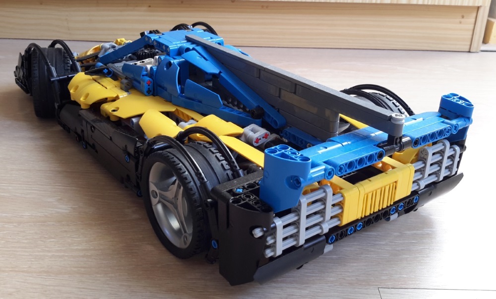 Deze geel-blauwe racewagen is gebouwd voor concours 27 van TechLug, thema “verbeter set 42039”. Het model heeft 1494 onderdelen.